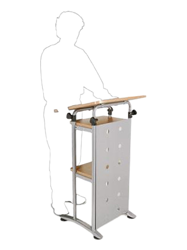The top surface adjusts in both height and angle, allowing you to find the perfect position for comfort and visibility. With two spacious shelves and a powder-coated steel fascia, this lectern is both functional and built to last.